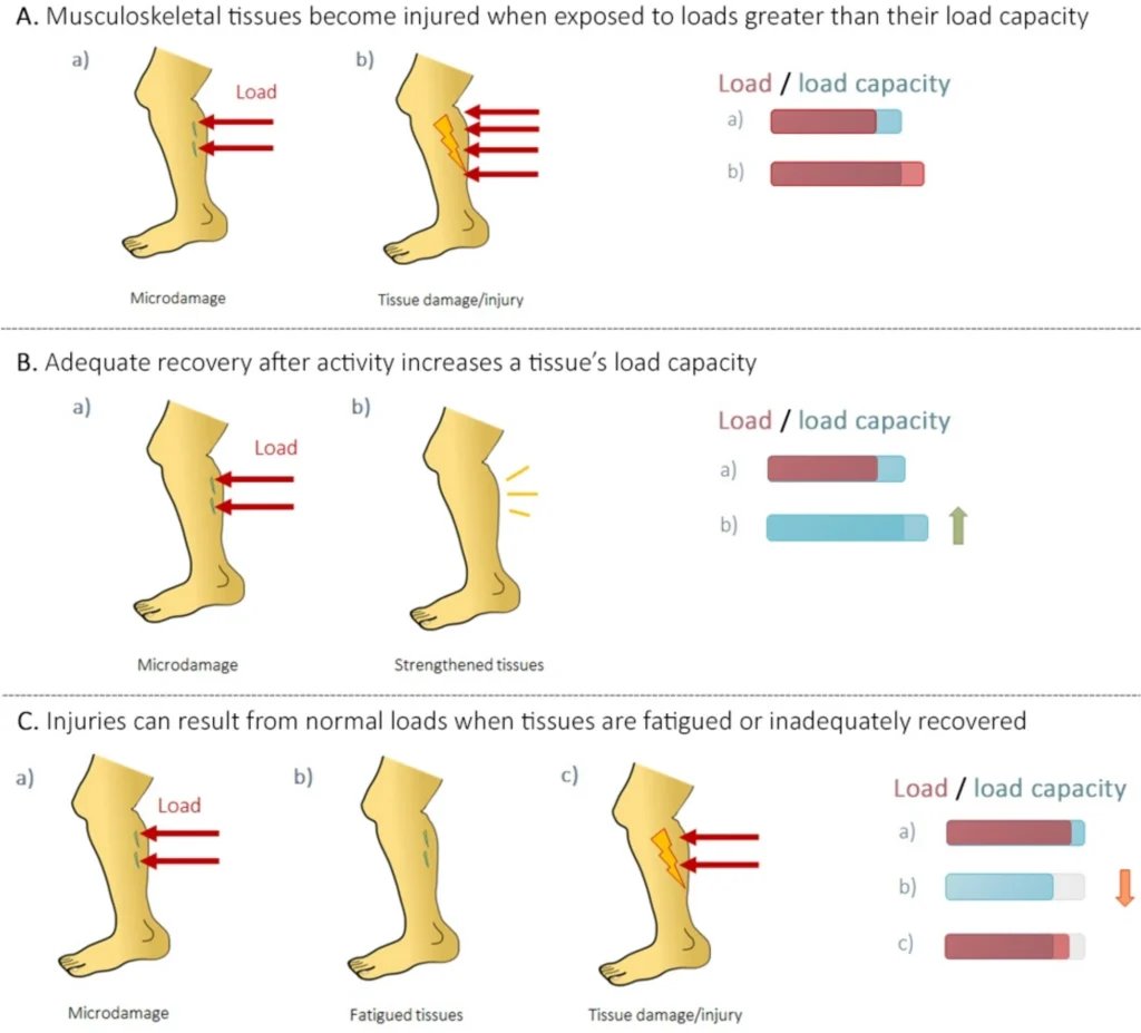 The body has the ability to adapt to mechanical load through tissue remodeling processes (tendon remodeling, muscle hypertrophy, bone remodeling). However, when the load exceeds the recovery capacity, this process becomes cumulative damage.