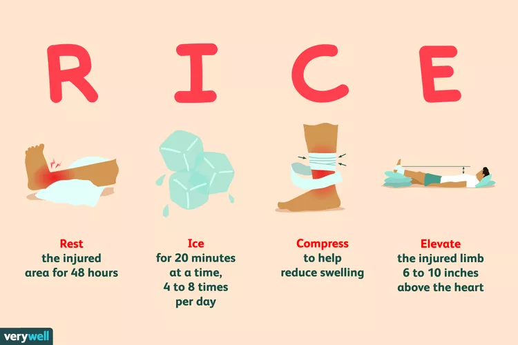 RICE: Rest – Ice – Compress – Elevate, basic first aid method for acute injuries. Source: verywellhealth.com