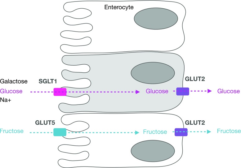 Figure 1: Mechanism of glucose and fructose absorption through small intestinal cells. Glucose uses the carrier SGLT1 (co-transporter with Na⁺) while fructose uses GLUT5 to move from the intestinal lumen (left) into the blood (right). Both then pass through the basement membrane into the blood via the GLUT2 channel.