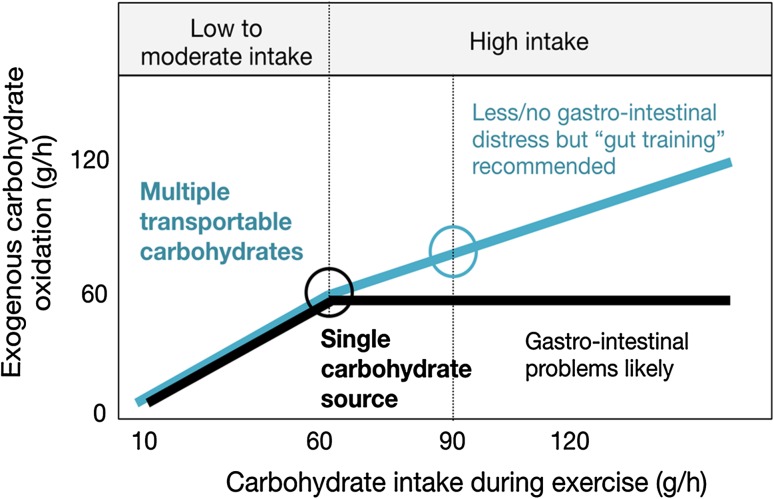 The recommended intake levels for simple carbohydrates and various transport carbohydrates are indicated by the circles in the figure. If simple carbohydrate sources are consumed at a rate higher than 60 g/hour, digestive problems are more likely to occur . With various transport carbohydrates, these symptoms are less common, but "gut training" (gradually acclimatizing to higher intake levels) is still recommended.