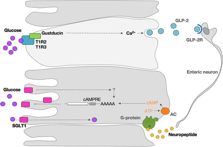This results in the secretion of GLP-1, GLP-2, and GIP . GLP-2 binds to the GLP-2R receptor on enteric neurons, triggering an action potential. This stimulation is then transmitted to the subepithelial regions via axons, leading to the release of a neuropeptide in the absorbing cells (enterocytes).