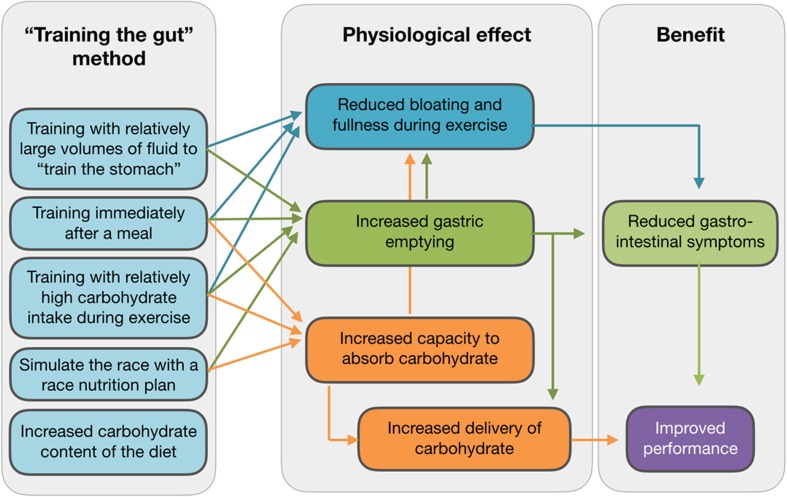 Figure 4. Summary of methods for “training the gut”, possible adaptations in the gut, and implications for athletic performance.