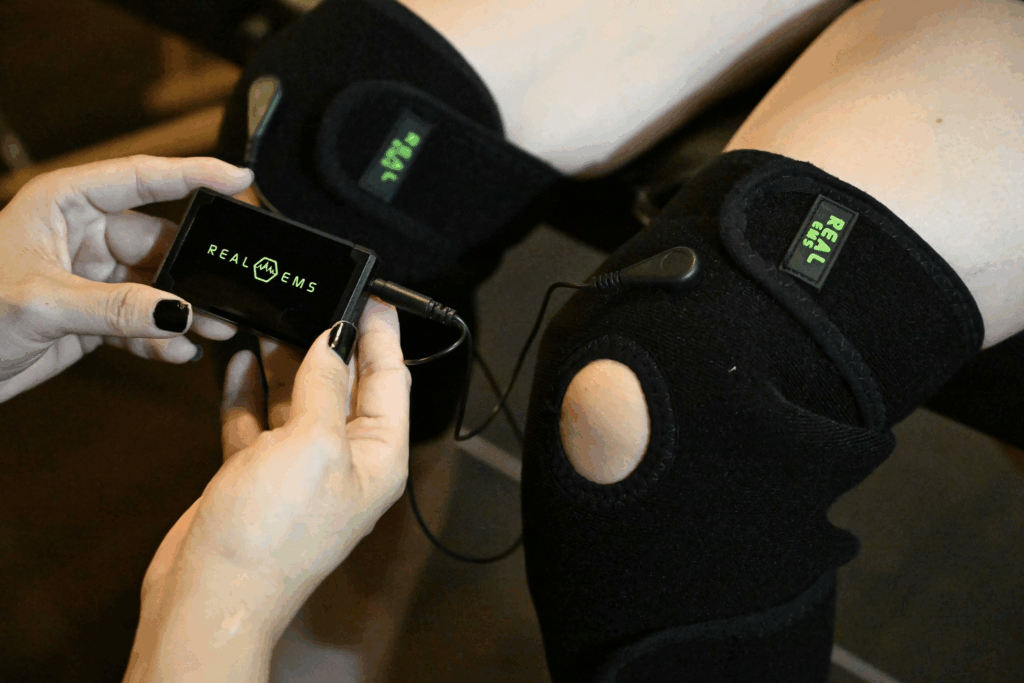 Real EMS helps stimulate muscles, improve circulation, and support knee recovery. Source: RealEmsVietNam