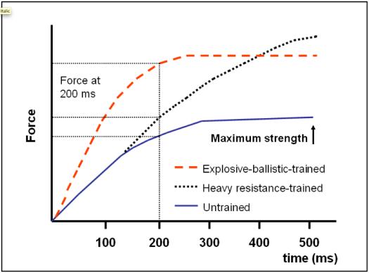 Those who train explosively (explosive-ballistic) generate more power in the first 200 milliseconds, while the non-training group generates power the slowest. Source: fitforgolf.blog