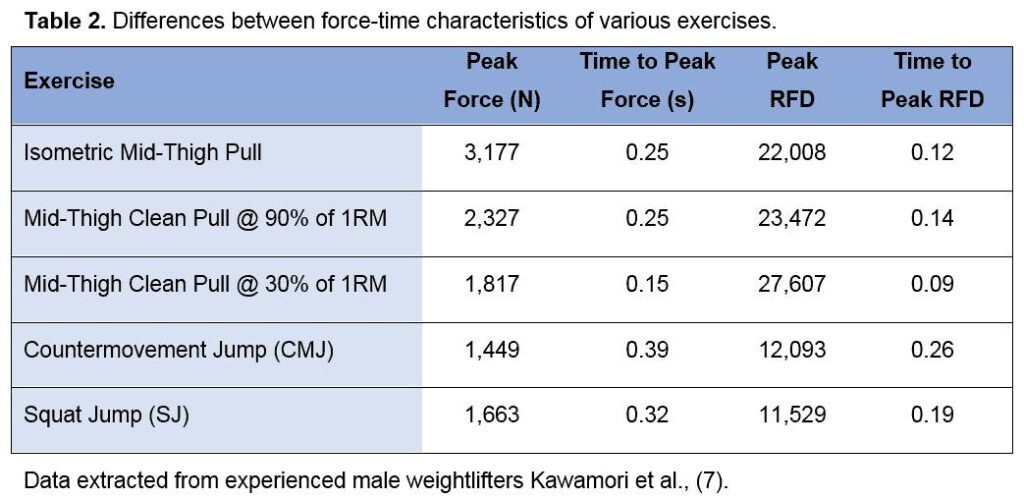 Different exercises generate different levels of force and force-generating speed, with mid-thigh clean pulls producing higher RFD than squat jumps and countermovement jumps. Source: scienceforsport.com